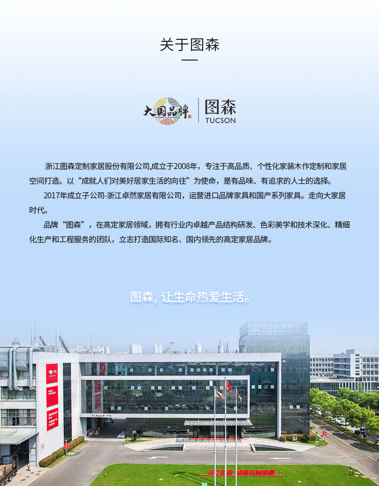 图森生产公司位于浙江省嵊州市浦口开发区,占地200余亩,一期厂房建筑面积为93000平方米,现拥有员工1400+名,其中车间一线员工多达1000余名。二期厂房己投入生产使用,建筑面积约64000平方米,成品仓库为10000平方米。全套引进德国、意大利先进生产线,是国内颇具实力的高定家居品牌。